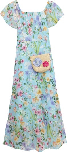 Your little one will feel their finest in this floral-printed frock framed by charming flutter sleeves and paired with a woven purse to hold their trinkets and treasures.