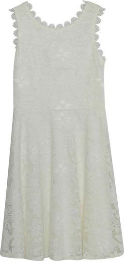 This skater dress detailed with floral lace and scalloped edges is perfect for warm-weather days.