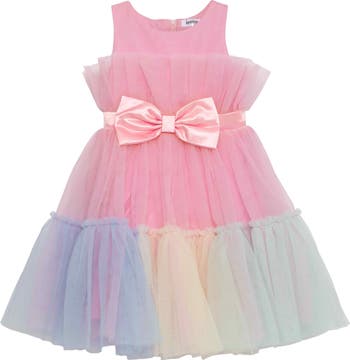 This colorful tulle sleeveless dress celebrates kid-approved imagination, featuring a dessert-inspired silhouette cinched with a satin ribbon.