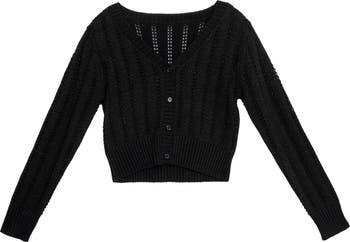 Sprinkled with metallic shimmer, this V-neck cardigan is knit with allover pointelle stitching for a close fit.