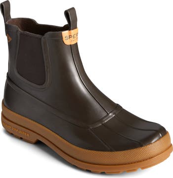 Be prepared for inclement weather with this waterproof rain boot that features the label's signature duck shell and a microfleece liner that work together to keep feet dry and warm in classic Sperry style. It's set on a lugged rubber sole with Wave-Siping™ technology for enhanced traction.