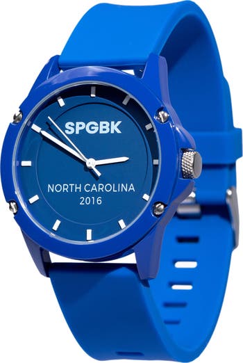 Polished hardware accents the case of this sleek monochrome watch featuring a minimalist face printed with an homage to SPGBK's North Carolina Roots.