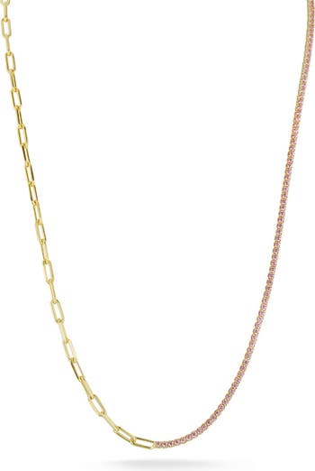 A contemporary paper-clip and tennis-chain necklace crafted in 14-karat gold plate features dainty cubic zirconia for a sparkling pop of color.