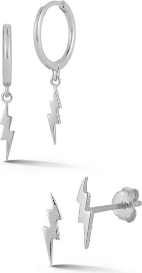 Show off this striking 14-karat gold vermeil or sterling silver earrings set including huggie hoop drops and studs featuring glossy lightning bolts.