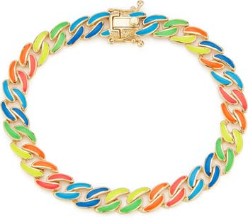 A rainbow colored chain bracelet with a hinge box clasp closure offers a colorful statement for any look.