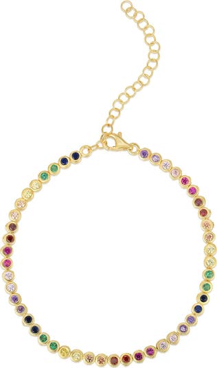 Glistening bezel set cubic zirconias add a shimmering effect for a 14k yellow gold vermeil tennis bracelet.