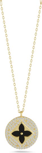 A clover design crafted from onyx centers this stunning pendant necklace encrusted with sparkling cubic zirconia.