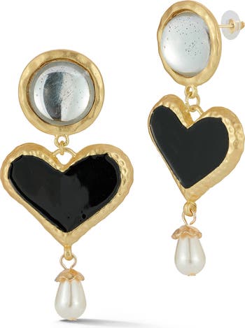 Enamel inlay and glossy faux pearls add contemporary shine to these heart drop earrings that add a dose of drama to your look.