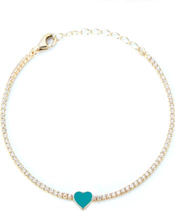 An enamel heart charm adds vibrant appeal to a CZ-adorned tennis bracelet plated in gleaming 14-karat gold.
