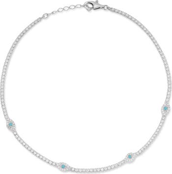 Ward off misfortune with this tennis anklet featuring stationed evil eyes filled with cubic zirconia and synthetic turquoise stones.