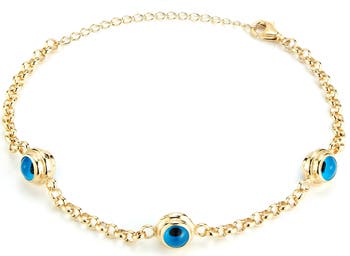 Bezel-set CZ sparkles on this evil eye station bracelet plated in gleaming 14-karat gold or polished rhodium.