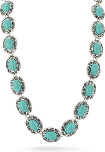 Oxidised, ornate details lend stand-out style to a strand necklace strung with faux turquoise to bring a pop of color to everyday looks.