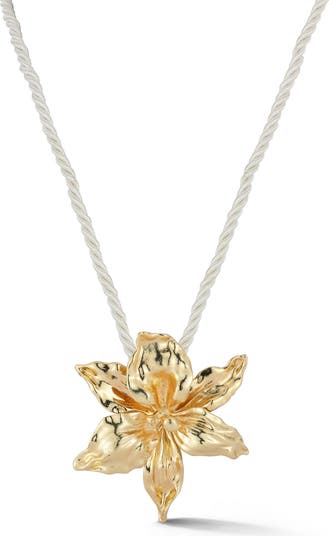 A molten, dimensional flower pendant brings striking shine to this resort-ready necklace anchored by a twisted cord.