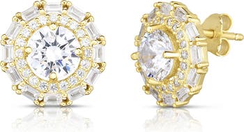 - - Gold vermeil CZ round and baguette double halo stud earrings - Post back - Approx. 0.5" - Imported