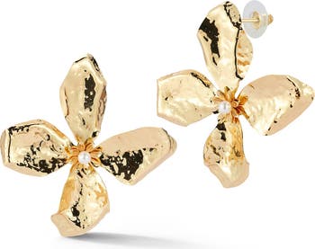 A hammered finish and glossy faux pearls add contemporary shine to these sculpted flower drop earrings that add a dose of drama to your look.