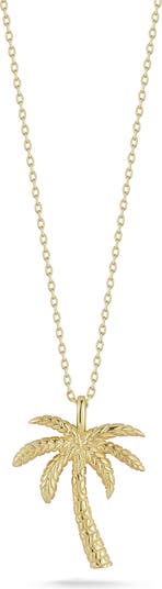 A textured etched design adds dimension to this vacation-ready palm tree pendant necklace that suspends from a dainty chain offering a dainty style.