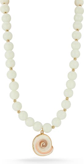 Cast your siren spell with this enamel-beaded necklace suspending a glossy shell-shaped pendant plated in warm goldtone.