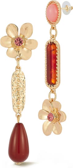 Elevate your look with these statement drop earrings that feature a gleaming hammered-metal design accented by stone-centered flower and bead adornments.