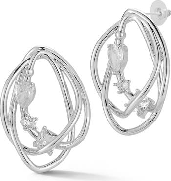 A trio of glistening white crystals brings sparkle and shine to the open silhouette of these frontal hoop earrings secured with a post back.
