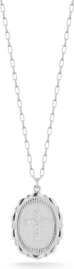 Glistening CZ stones define a cross that details a textured oval pendant necklace made from enduring rhodium-plated sterling silver.