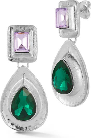 Elevate your evening ensembles with these statement drops boasting an emerald-cut purple cubic zirconia stud and a verdant teardrop-shaped one.