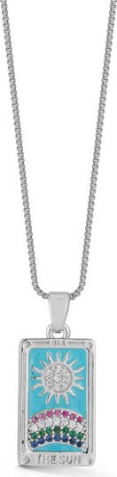 Elevate your everyday style with this box-chain necklace suspending a tag pendant inset with a pavé sun and rainbow.