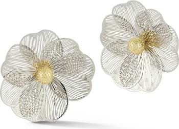 Show off striking shine with whimsical floral stud earrings boasting a glossy two-tone finish.