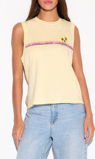 Show off your toned shoulders in an all-cotton tank with a weathered chest-stripe graphic that gives you a Venice Beach boardwalk look.