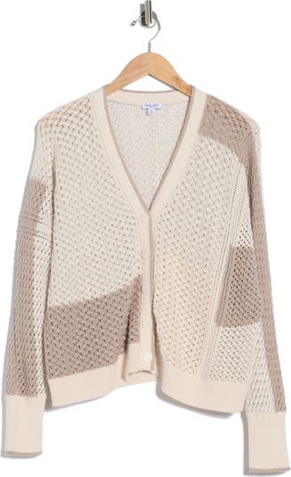 Airy open stitches enhance the breathable comfort of this cool colorblock cardigan knit from soft cotton yarns.