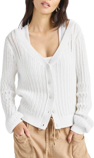 Just in time for warm weather is this airy open-stitch cardigan knit in a slightly cropped length for an on-trend look.