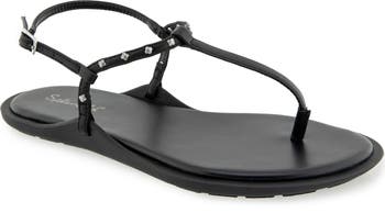 A T-strap silhouette lends classic appeal to a summery faux-leather sandal complete with polished studs that shimmer along the ankle strap.