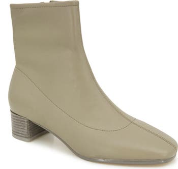 A squared-off toe and stacked block heel balance a rich leather bootie fashioned with a side zipper for easy entry.