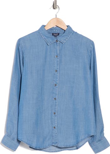 Long sleeves and a spread collar frame this chambray button-up shirt made from lightweight fabric for a breezy style that looks good all year long.