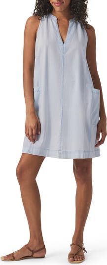 Feel the ease of this roomy sleeveless shift made in a soft indigo wash and fitted with handy patch pockets.