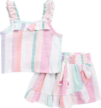 Cotton candy-colored stripes distinguish a tank and skirt set that are outlined by frilly ruffles for chic style.