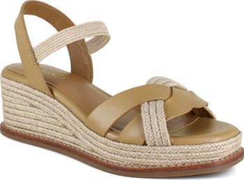Rough, braided jute trims the sensible platform wedge heel of a summer-ready sandal furnished with an elastic vamp strap for a flexible, no-fuss fit.