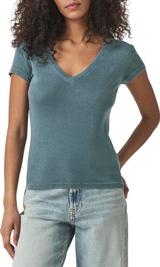 Achieve a casual-cool vibe in this soft cotton-blend T-shirt designed with a dipped neckline and abbreviated sleeves.