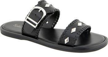 Gleaming diamond studs punctuate two straps finished with whipstitching on this slide sandal made from faux leather.