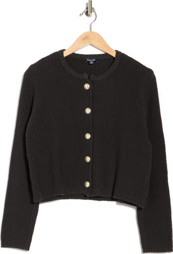 A row of polished buttons shine brightly at the placket of a cuddly knit cardigan that brings a combination of warmth and posh style to everyday looks.