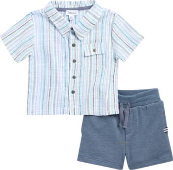 Keep baby comfy and cute in this two-piece set with a striped button-up shirt and drawstring-waist shorts.