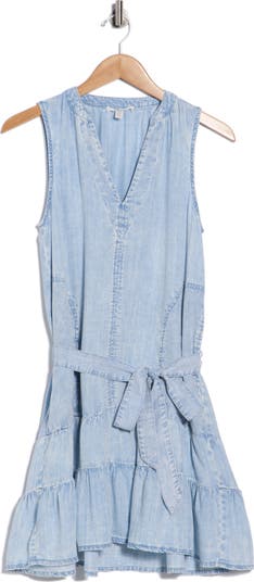 Perfect for casual days, this sleeveless chambray dress is framed by handy pockets, a removable tie belt and fluttery flounced hem.