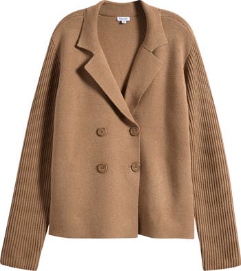 Dropped shoulders further the relaxed styling of this double-breasted jacket knit from soft yarns.