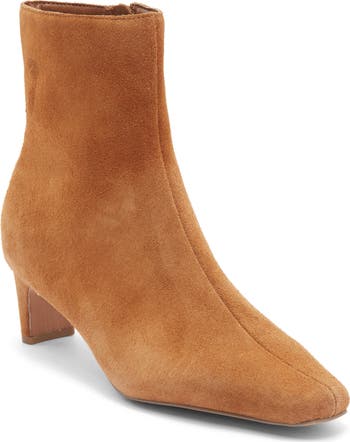 Soft suede elevates this chic almond-toe bootie framed by an easy side-zip closure and lifted by a slender wrapped heel.
