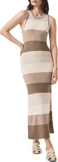 Horizontal colorblocked stripes style the body-skimming ribbed silhouette of this sweater dress that's easy to style up or down.