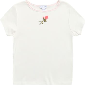 Your junior trendsetter will show off their budding sense of style in this stretchy cotton-and-modal top detailed with rose embroidery.