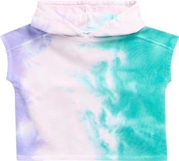 Bold splashes of tie dye bring unmistakable warm-weather charm to a cotton-blend hoodie framed by short sleeves.