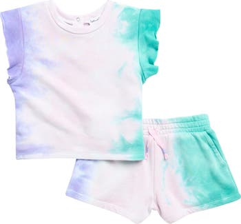 A vibrant tie-dye print lends unmistakable warm-weather charm to a top and shorts set made from a soft cotton blend.