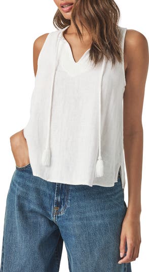 Tassel ties swing from the neck of this flowy linen-blend top made with a tuckable high/low hem.