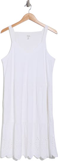A tiered silhouette composed of mixed-scale cotton-eyelet paneling creates striking textural contrast in this breezy sundress finished with a scalloped hemline.