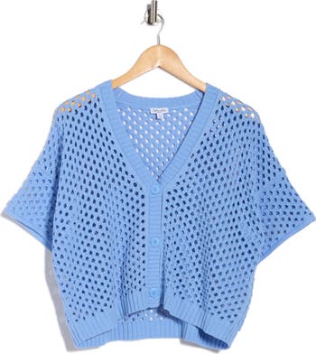 Breezy and cozy coexist in this layer-ready short-sleeve cardigan knit with pointelle stitching.